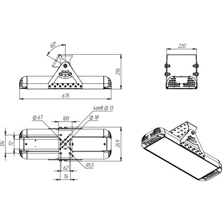 | Габаритные размеры светильника, мм | 675х250х255 |