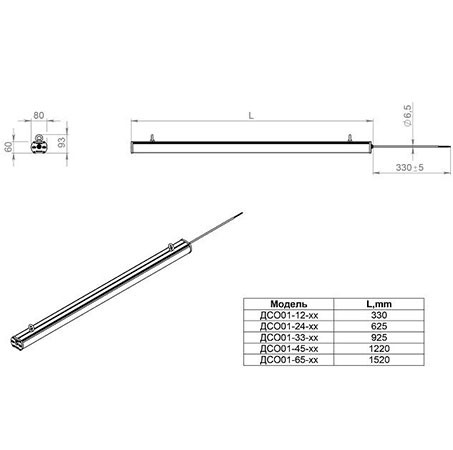 Габаритные размеры светильника, мм 80х600х60