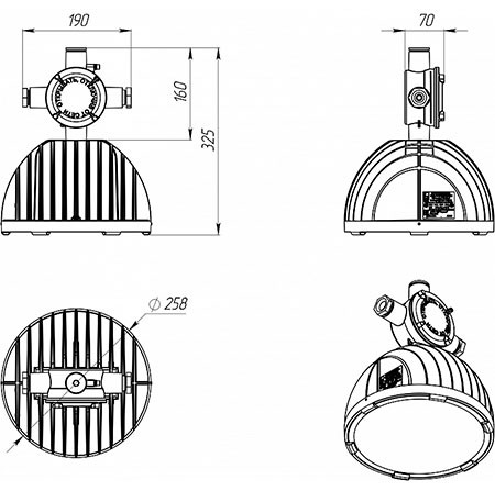 Имеет маркировку взрывозащиты 1Ех е mb II T4 Gb X/Ex tb mb IIIС T80 ˚C Db X. Может применяться для освещения различных объектов, не исключая зон, опасных по воспламенению горючих газовоздушных смесей, и зон, опасных по воспламенению горючей пыли.