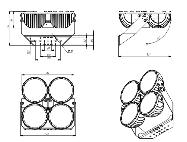 Светильник монтируется на поворотный кронштейн. Обеспечена высокая световая отдача: 140 Лм/Вт.